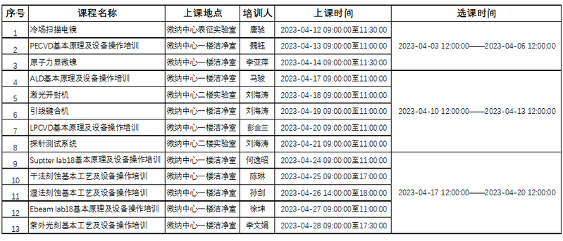 2023年春季学期设备培训安排已出,课程安排详情: