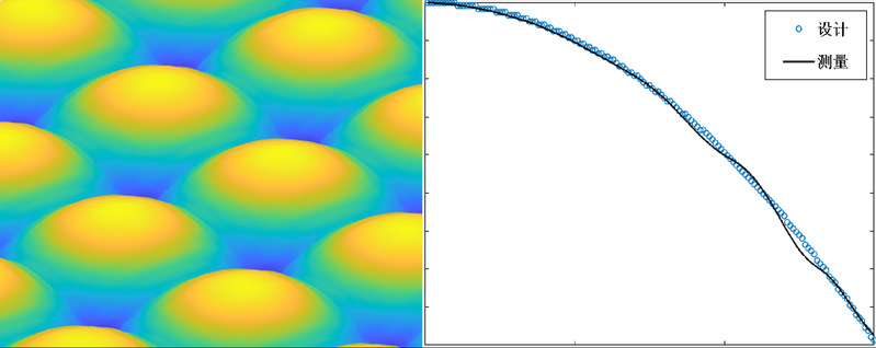 微透镜阵列三维测量图(左),设计与测量截面轮廓对比图(右)。