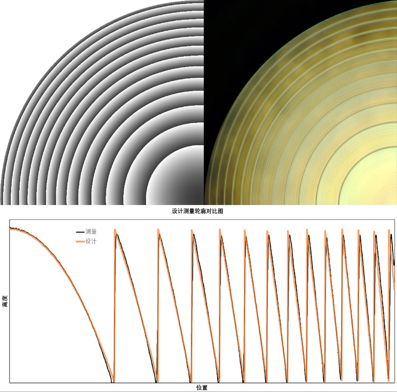 菲涅尔透镜设计图(左上),加工实物图(右上),设计与测量轮廓对比(下)。
