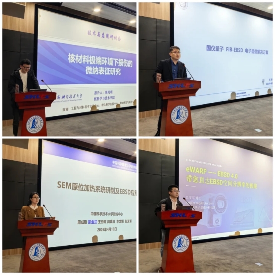 在主题报告环节,中国科学技术大学反应堆材料实验室陈尚明博士以《EBSD技术在聚变堆材料微观表征中的应用探索》为题,分享了EBSD技术在前沿材料研究中的实践成果;国仪量子高原总监详细介绍了《国仪量子双束电镜EBSD联用技术及原位表征解决方案》,展示了国产仪器在该领域的技术突破;中国科学技术大学微纳研究与制造中心彭金兰工程师带来《扫描电镜原位加热系统研制及EBSD应用初探》,分享了原位表征技术的研发进展;布鲁克公司禹宝军博士则以《eWARP:开启EBSD技术新纪元》为题,解读了EBSD技术的最新创新成果。